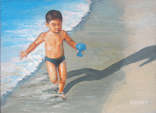 Background first. I divided it into three different sections. Sky, water and sand. Rather than painting directly from the tubes, I mix the paints on the pallete before applying it on the board. The sky leans on the blue side, the sea on the greenish, and the sand on the yellowish.